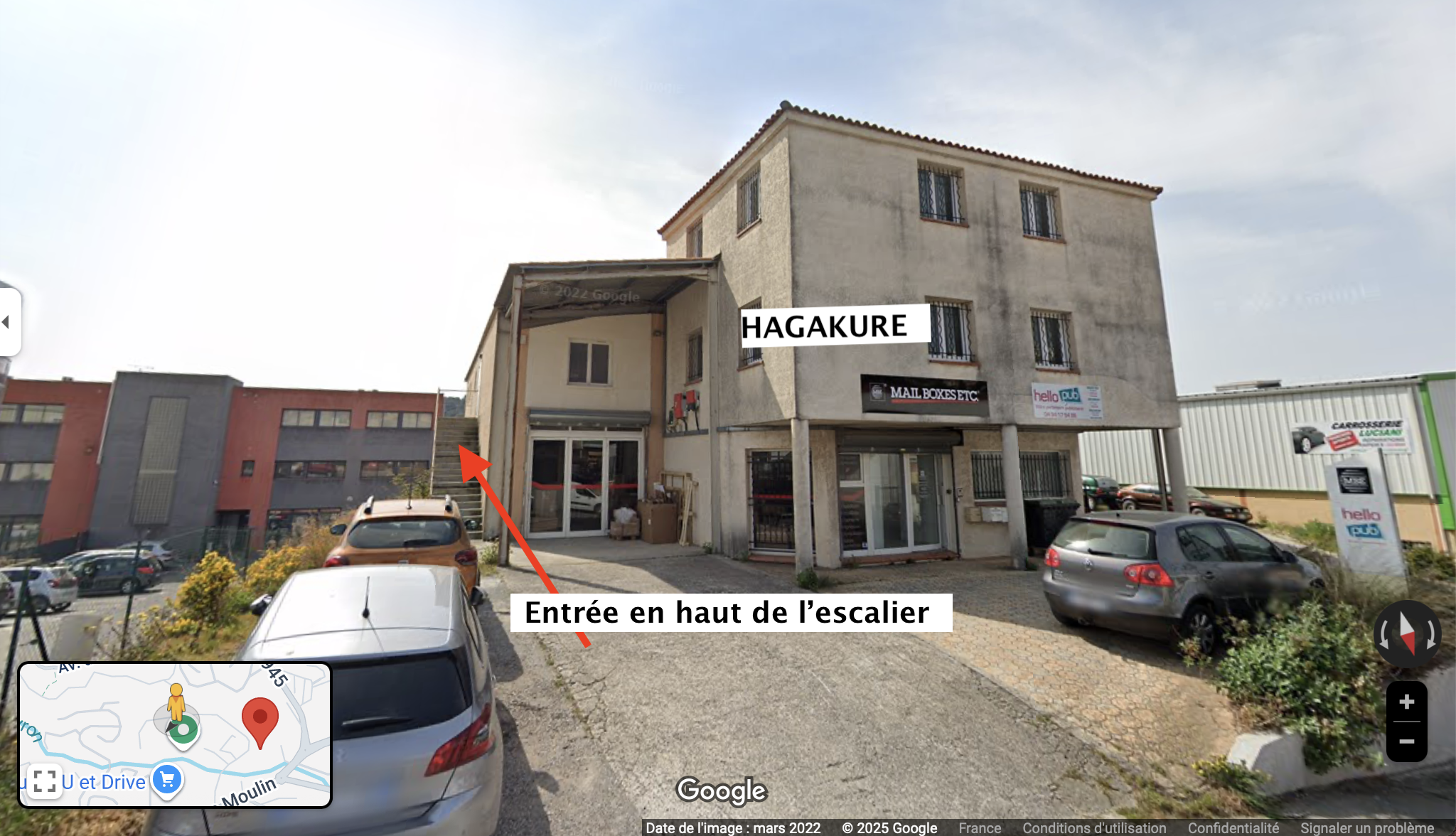 L'entrée du club se situe en haut de l'escalier sur la gauche du bâtiment